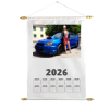 White polyester calendar with wooden rods and cord. Size 35x50 cm approximately.